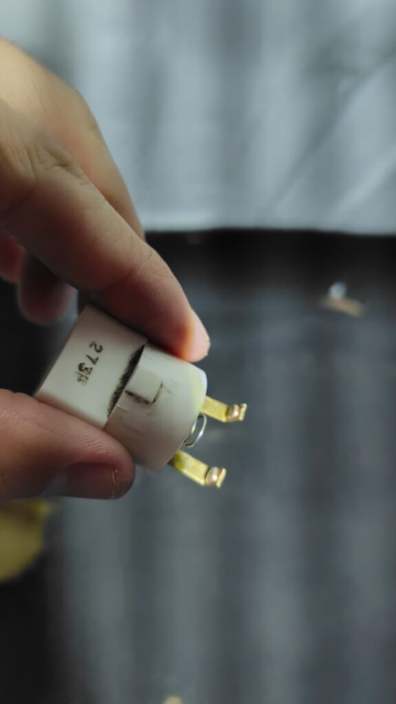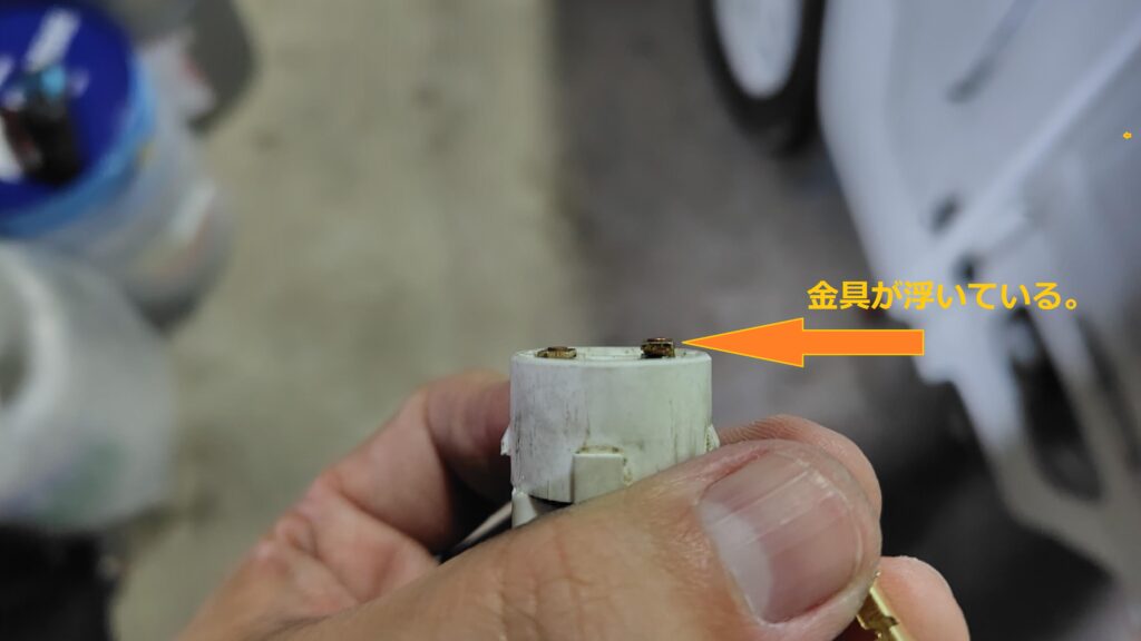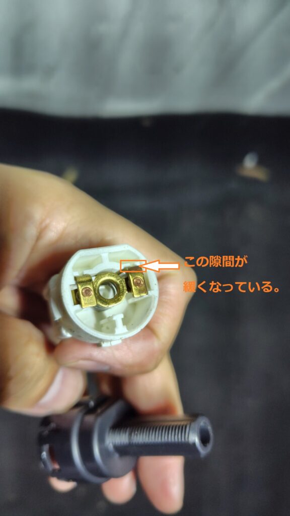 ここで、今回の直接的な原因が判明!しっかり奥に固定させてなければならない接点金具が、プラスチックの抑えが不十分で浮いてきています。片側の接点がうまくくっ付かないことにより、ブレーキランプが点かなかったということですね。