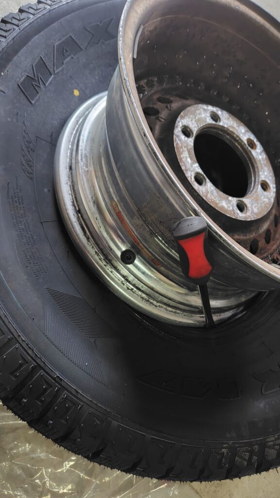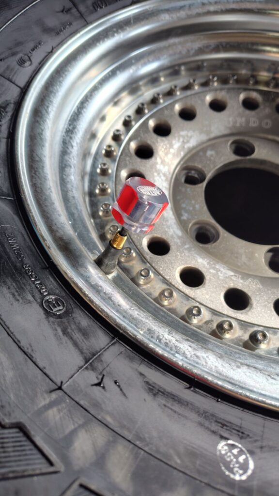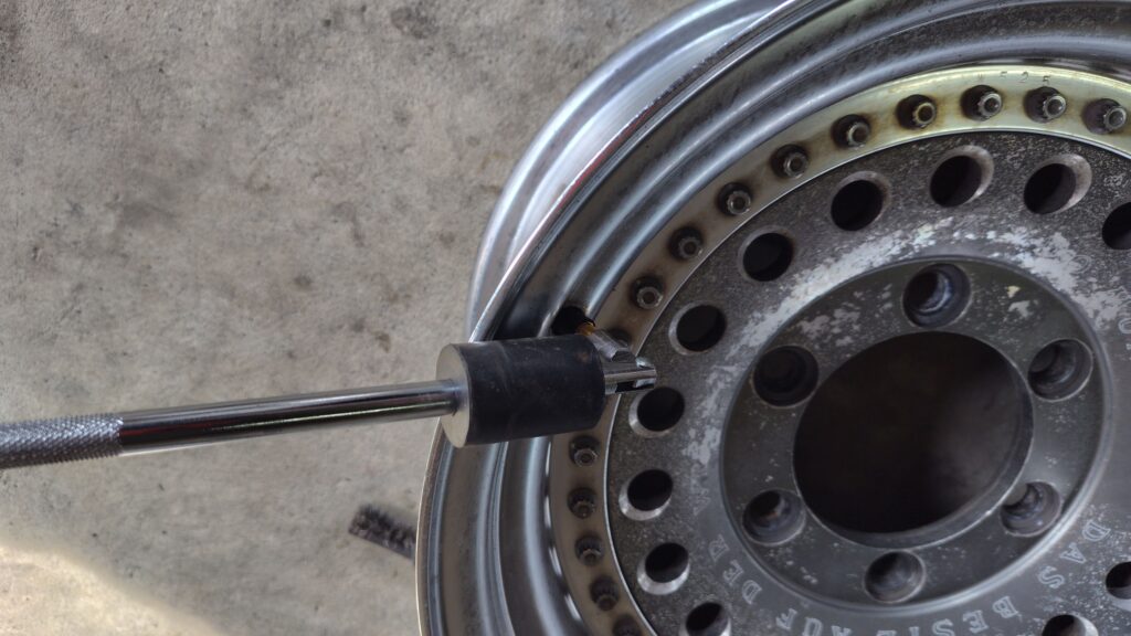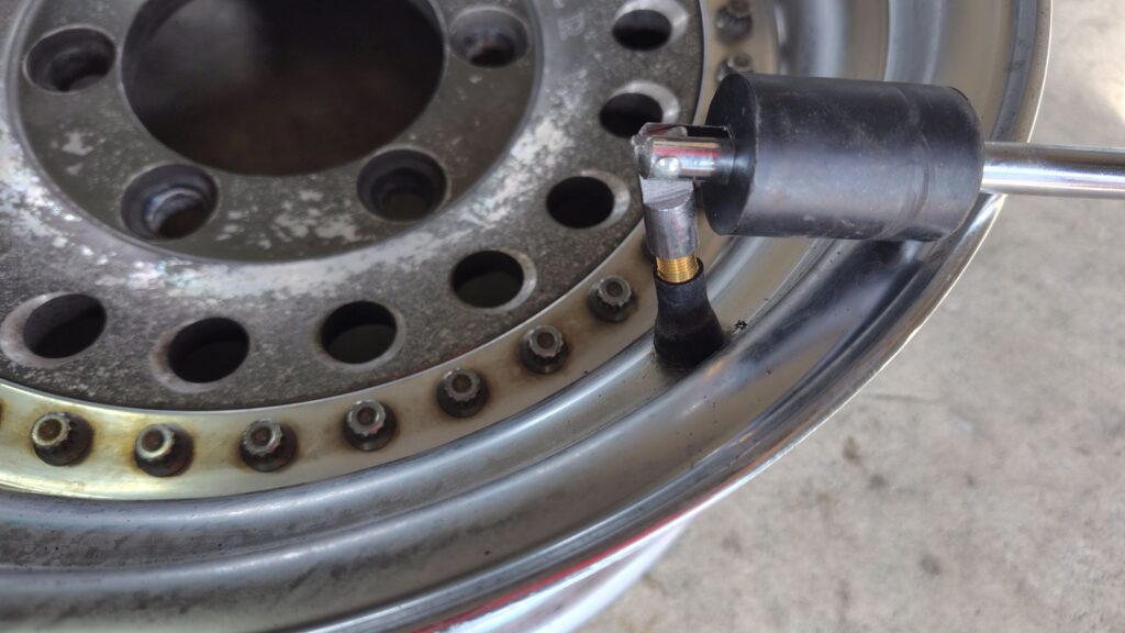 タイヤのビードがしっかりはまり込んでエアーが充填されたら、エアゲージ(空気入れ)を外し、エアーがブシューっと抜けますが、それに反発しながらバルブコアドライバーを使って、バルブコアを締め付けます。