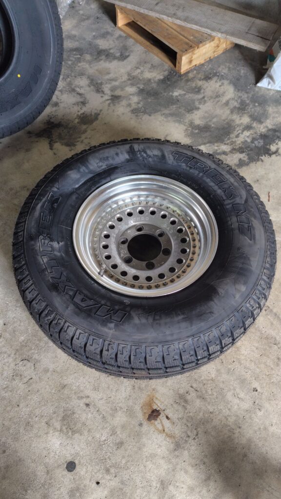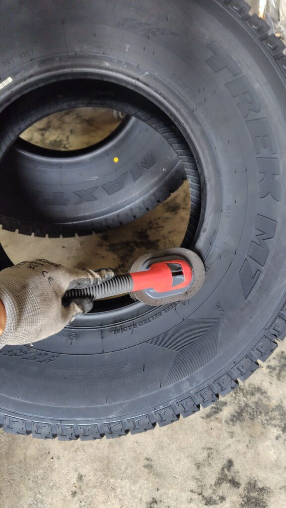 実際に組み終わったタイヤです。今回チョイスしたMAXTREKは、片面にしか軽点マークが打っていなかったので、裏面に軽点マークがあります。